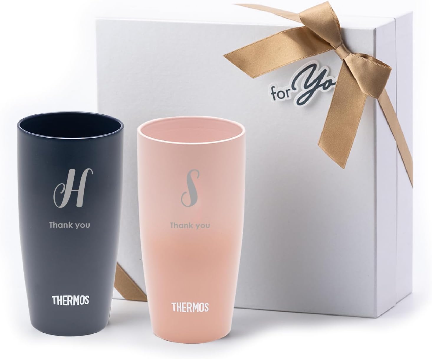 名入れ THERMOS (サーモス) 真空断熱タンブラー THE WOW 【名入れ対応/メッセージカード対応/ラッピング対応】 ((A)ダークネイビー×(B)ローズベージュ, [名入れあり / 420ml]ペアセット) イニシャル 真空断熱構造 2個セット 保温 保冷 名前入り ステンレス 結露しない ウエディングギフト 結婚祝い 新築祝い