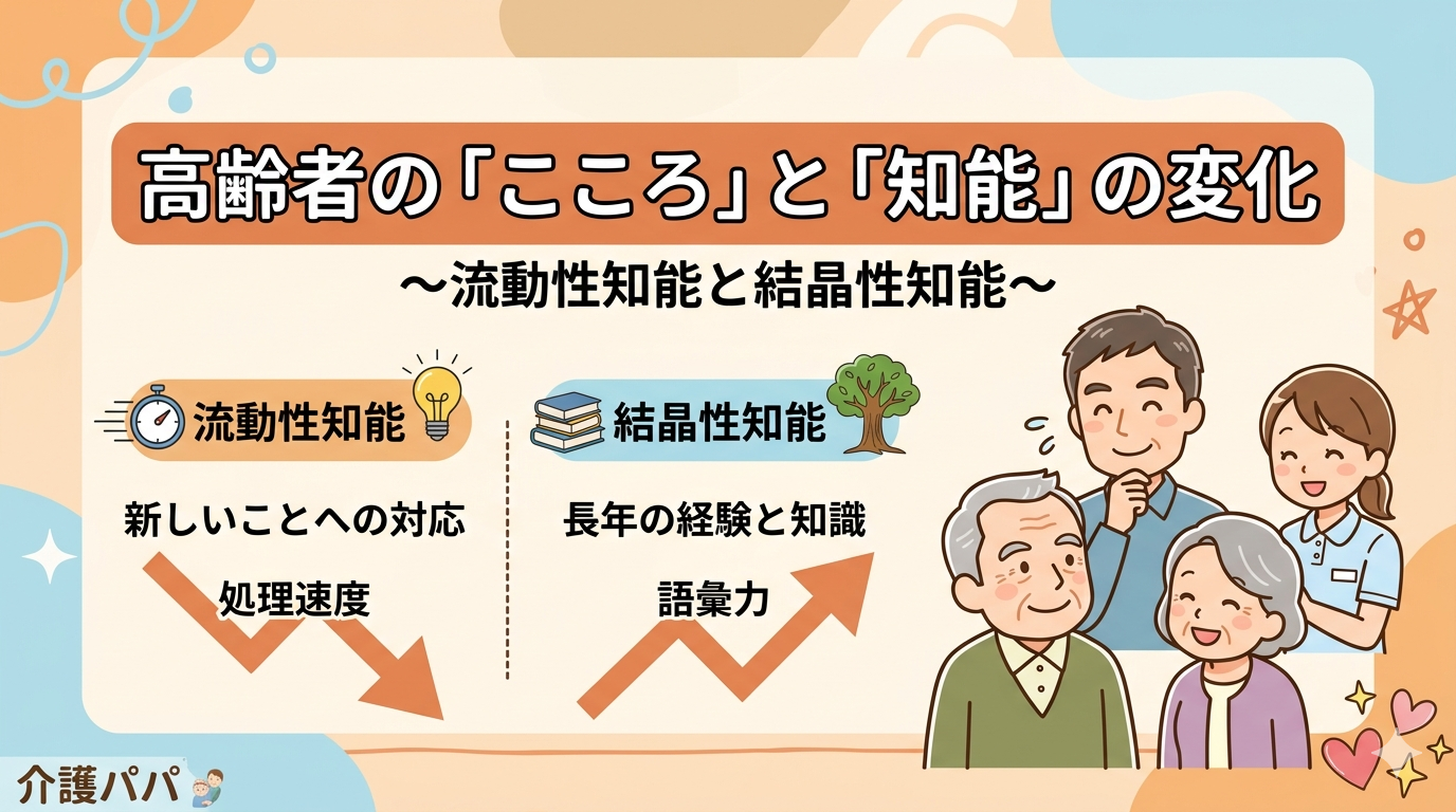 この記事では、高齢者の知能の特性である「流動性知能」と「結晶性知能」について分かりやすく解説します。この違いを知ることで、高齢者への声かけやケアのヒントが見つかるはずです。