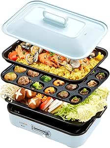 SOLEMOOD コンパクトホットプレート グリル鍋 着脱式プレート 温度調節機能付き 洗いやすい おしゃれ かわいい 1000W高出力 プレート選択可能 1~4人用 小型 ひとり暮らし にも (プレート3種(平面・たこ焼き・鍋)-ブルー)