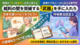 介護福祉士のお勉強 【2026年版】介護福祉士+αで生き残る!「給料の壁」を突破する武器としての資格戦略✏ 「介護福祉士の資格だけで将来は大丈夫?」と不安な方へ。2026年以降、選ばれる介護職になるための+α資格を現役視点で厳選。リハビリセラピストや呼吸療法認定士など、現場で即役立ち、キャリアの武器になる資格のメリットを分かりやすく解説します。 2022.09.12 介護福祉士のお勉強